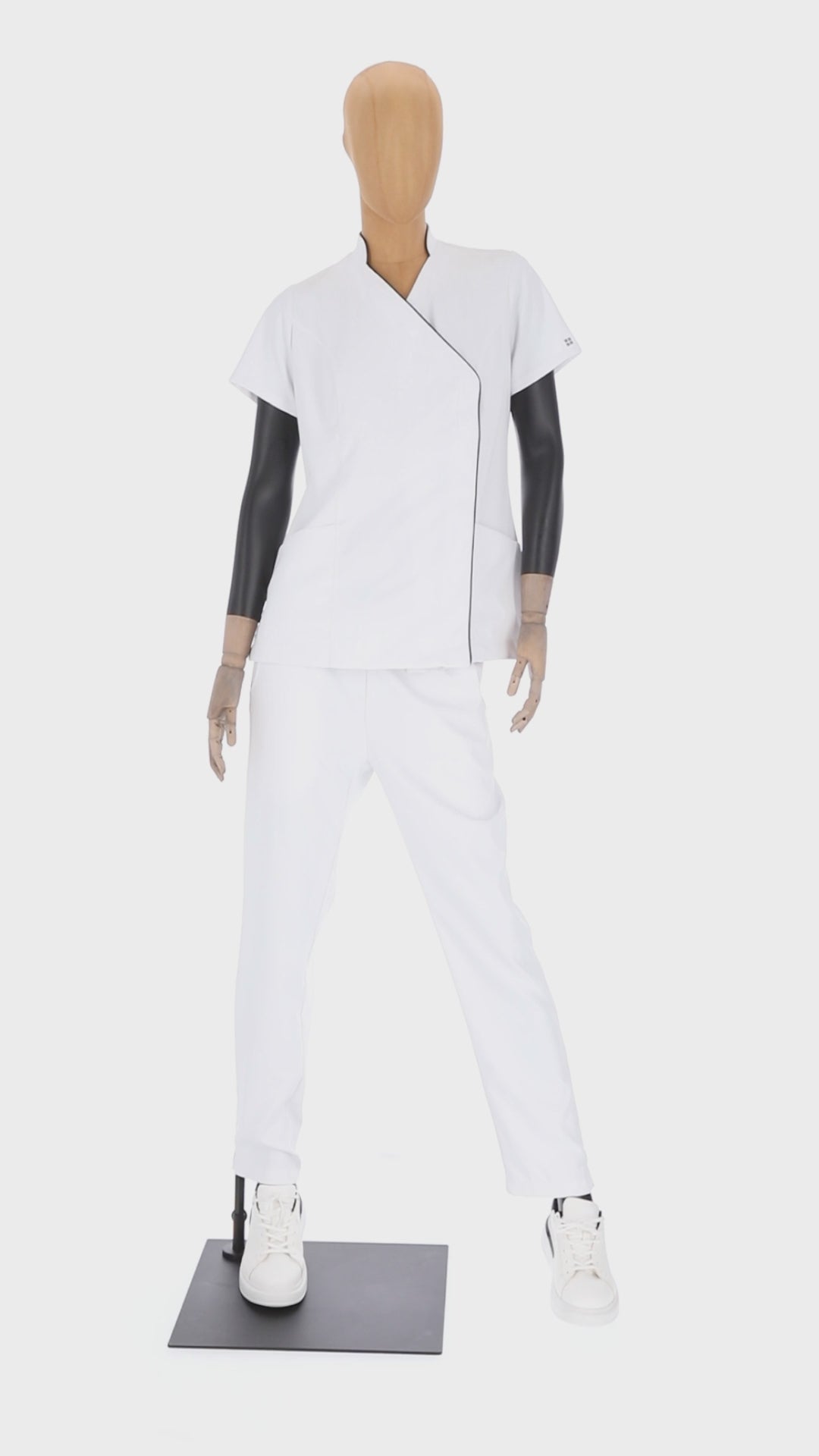 Filipina NEAT 100% poliéster con vivos a contraste y dos bolsas al frente. Cruzada con botones ocultos y cuello mao. Ideal para SPA, salones de belleza o cuidado del hogar. Pantalón a juego disponible.